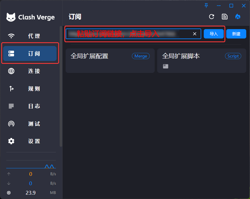 进入 订阅 界面,在顶部输入或者粘贴您的 Clash 订阅链接,然后点击 导入 按钮。